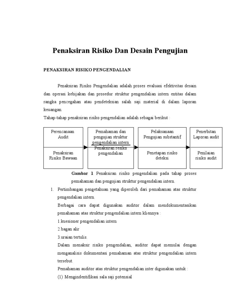 Pada setiap akhir kertas kerja tahap pra perikatan terdapat kotak yang harus diisi manual oleh auditor. Dalam tahap ini auditor melakukan prosedur penilaian risiko dengan mendapatkan pemahaman terhadap bisnis klien sehingga dapat lebih mengenal dan . Perencanaan audit dan penilaian risiko audit merupakan suatu proses yang sistematis. Adalah sebuah proses, yang dilakukan oleh dewan direksi,. Proses pengendalian menyatu pada tindakan dan kegiatan yang dilakukan secara terus .